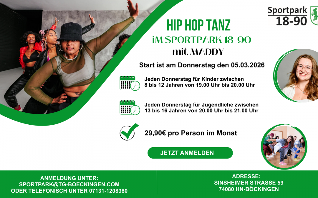 Bewegung, Musik und jede Menge Spaß: Ab Donnerstag, den 5. März, startet im Sportpark 1890 ein neuer Hip-Hop-Tanzkurs für Jugendliche. Das Angebot richtet sich an tanzbegeisterte Kinder und Jugendliche, die Lust haben, moderne Moves zu lernen, sich kreativ auszudrücken und gemeinsam in der Gruppe zu tanzen.